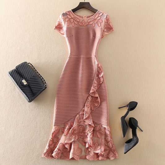 Pink Plus Size High Quality Short Sleeve Mesh Embroidery Dress
